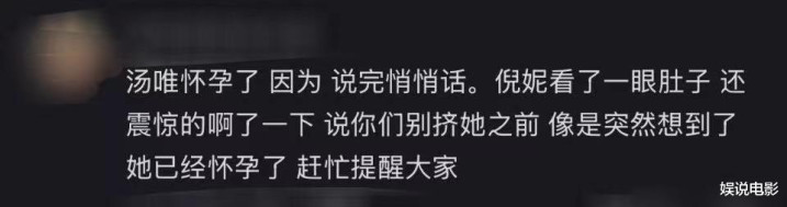 倪妮操心被专家读出唇语,是以用手遮住了嘴巴,固然她还看了汤唯的肚子。