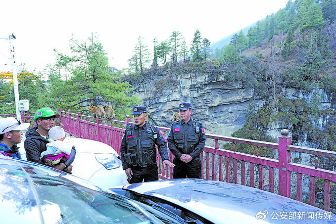 “您好,请贯注保握安全投喂距离。景区内禁绝抽烟,提神丛林失火。”民警普布旺堆和辅警多吉加布穿梭在南来北往的东说念主群中,时时对旅客发出安全请示。