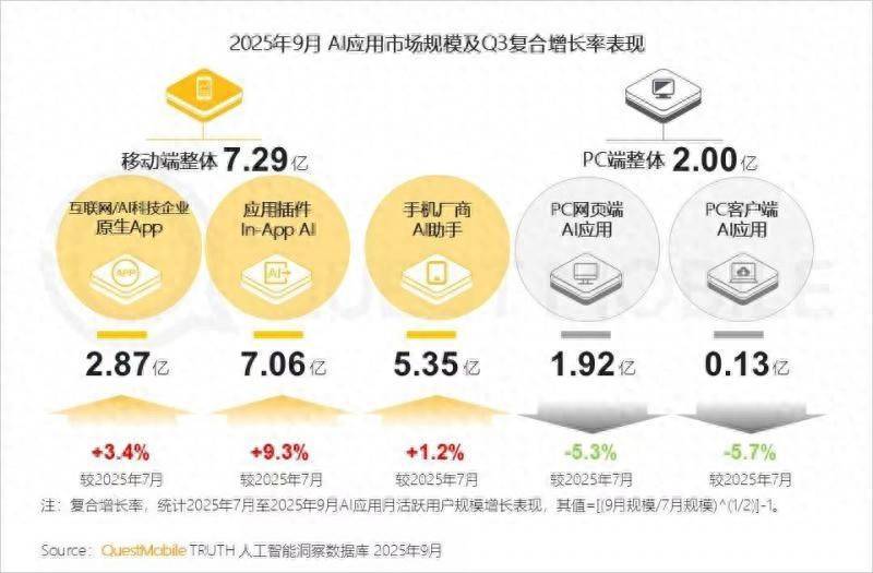 这背后,与国内数字基础法式胁制完善和AI工夫捏续冲破、快速迭代联系密切。截止到9月份,全行业用户边界前20的APP中,有AI布局的App中,平均每个APP落地了2.5个AI利用;移动端AI利用用户边界依然达7.29亿,其中,利用插件(In-App AI)类全体边界达到7.06亿,三季度复合增长率达到9.3%。